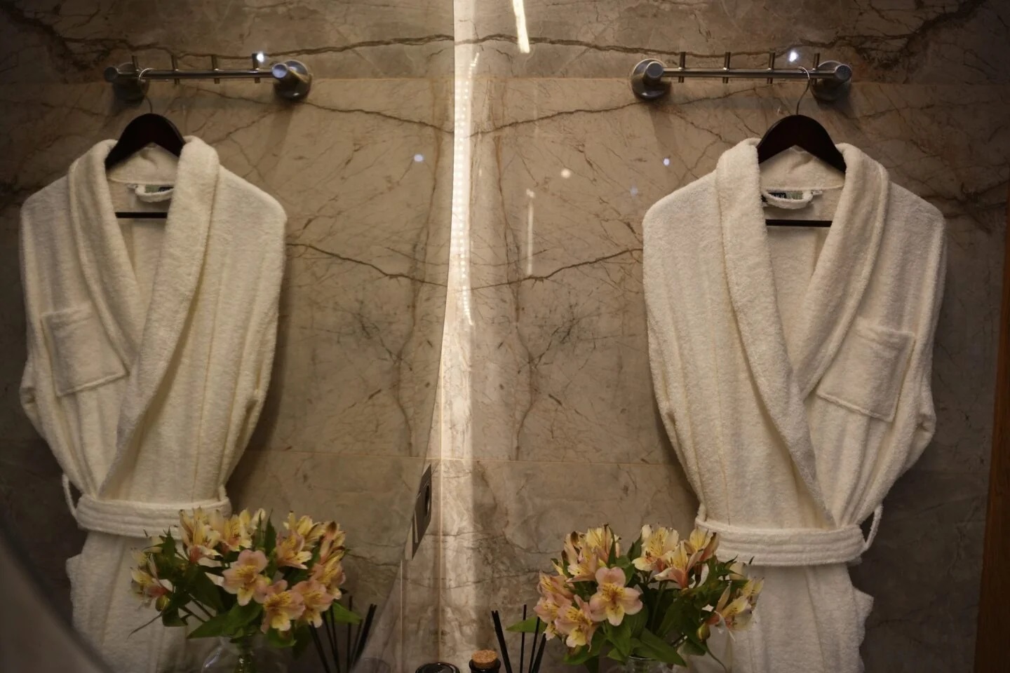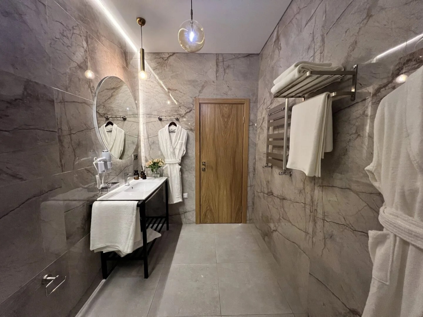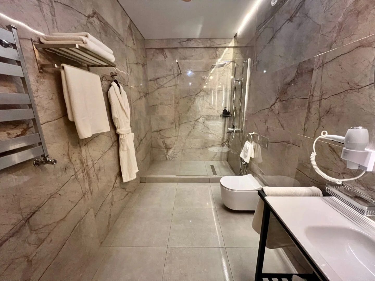- Санузел: с душевой кабиной, тапочки, туалетные принадлежности, фен, халат